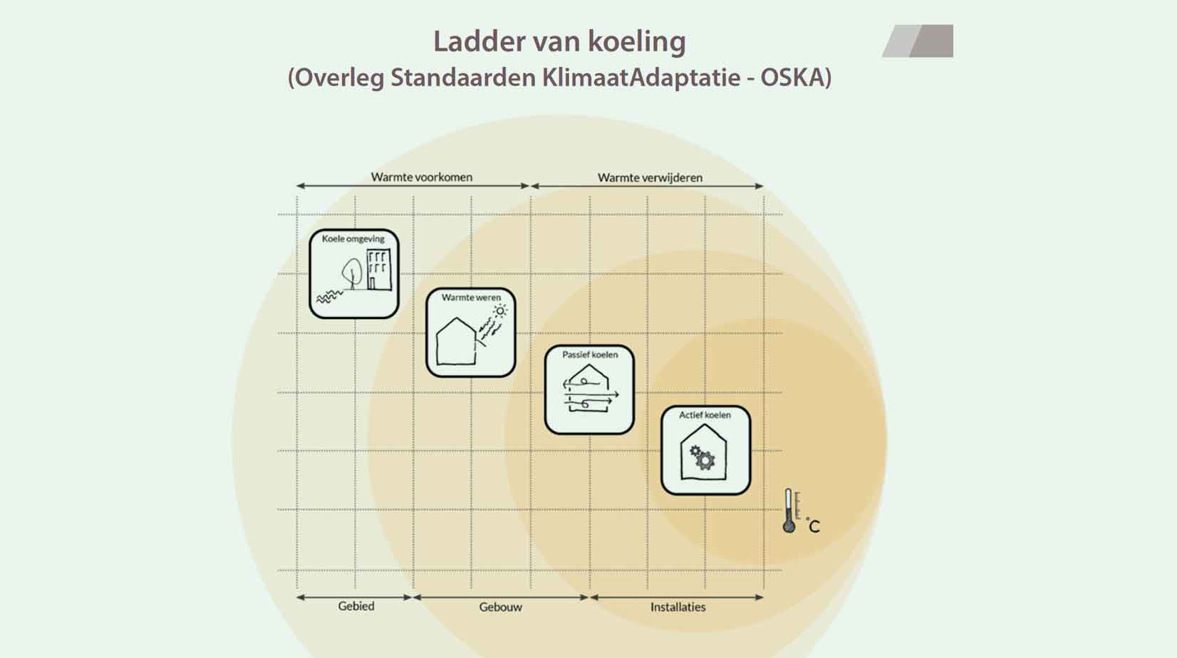 Zowel het tegengaan van verdere klimaatopwarming als het vermijden van te hoge binnentemperaturen is noodzakelijk. Hoe? Met natuurlijke koeling dankzij bomen of water in de omgeving en door gebouwen zo te oriënteren en slim te ontwerpen dat warmte geen kans krijgt om de woning binnen te dringen. Maar ook door warmte die binnen zit eerst op een passieve manier terug buiten te krijgen en pas in laatste instantie naar actieve koeling te grijpen.